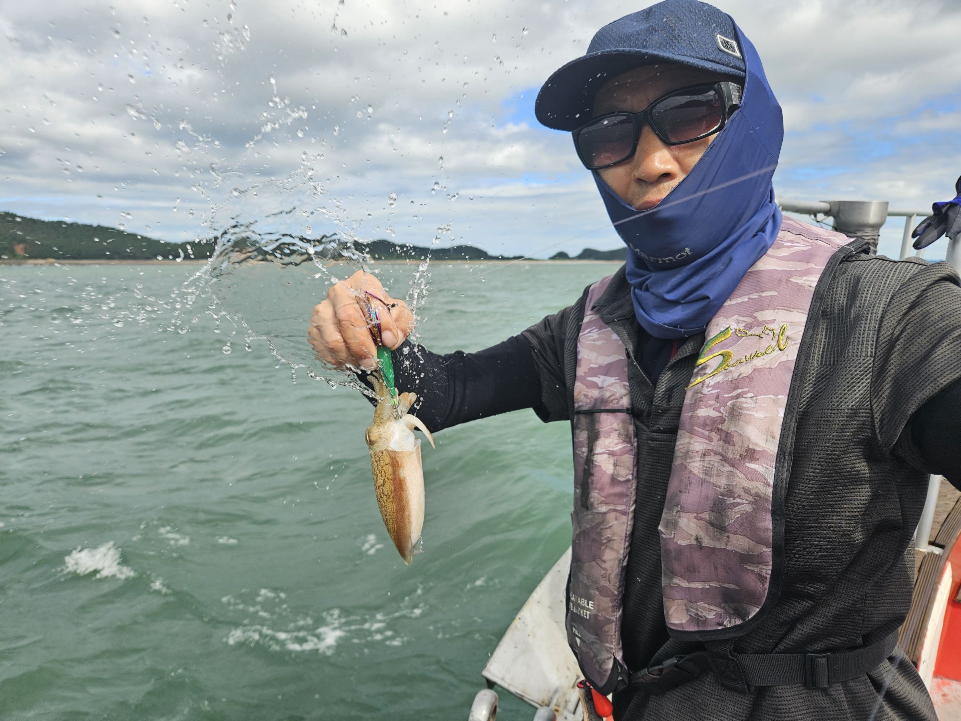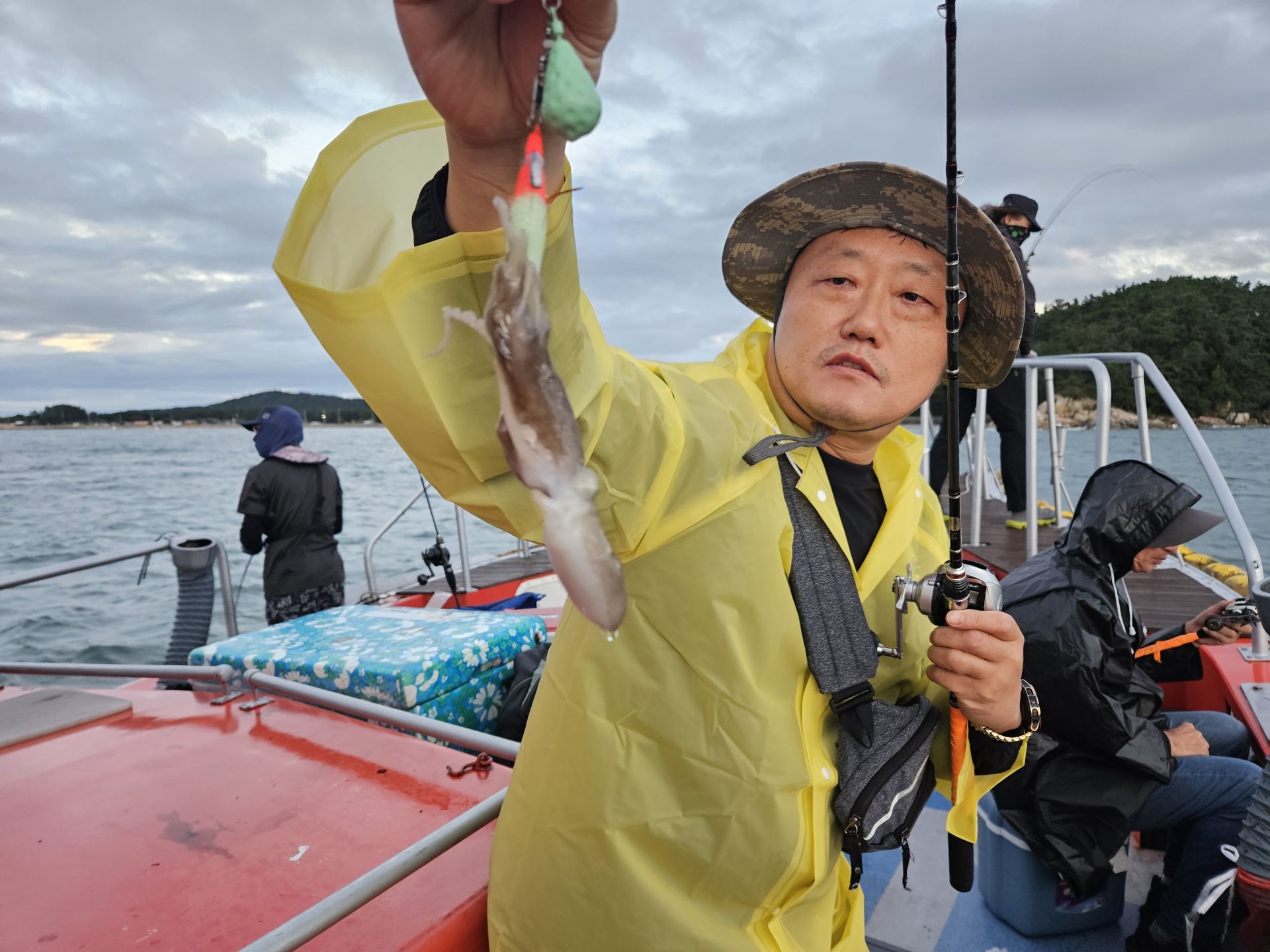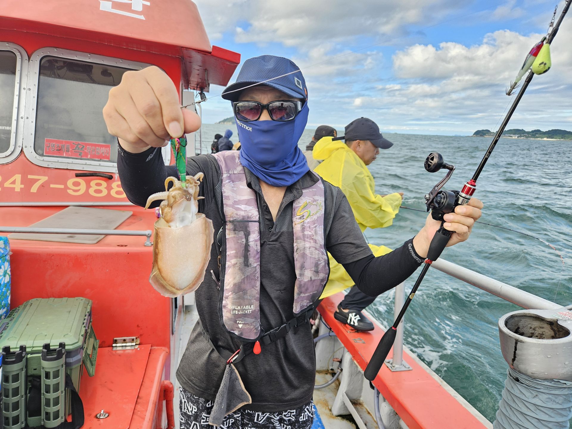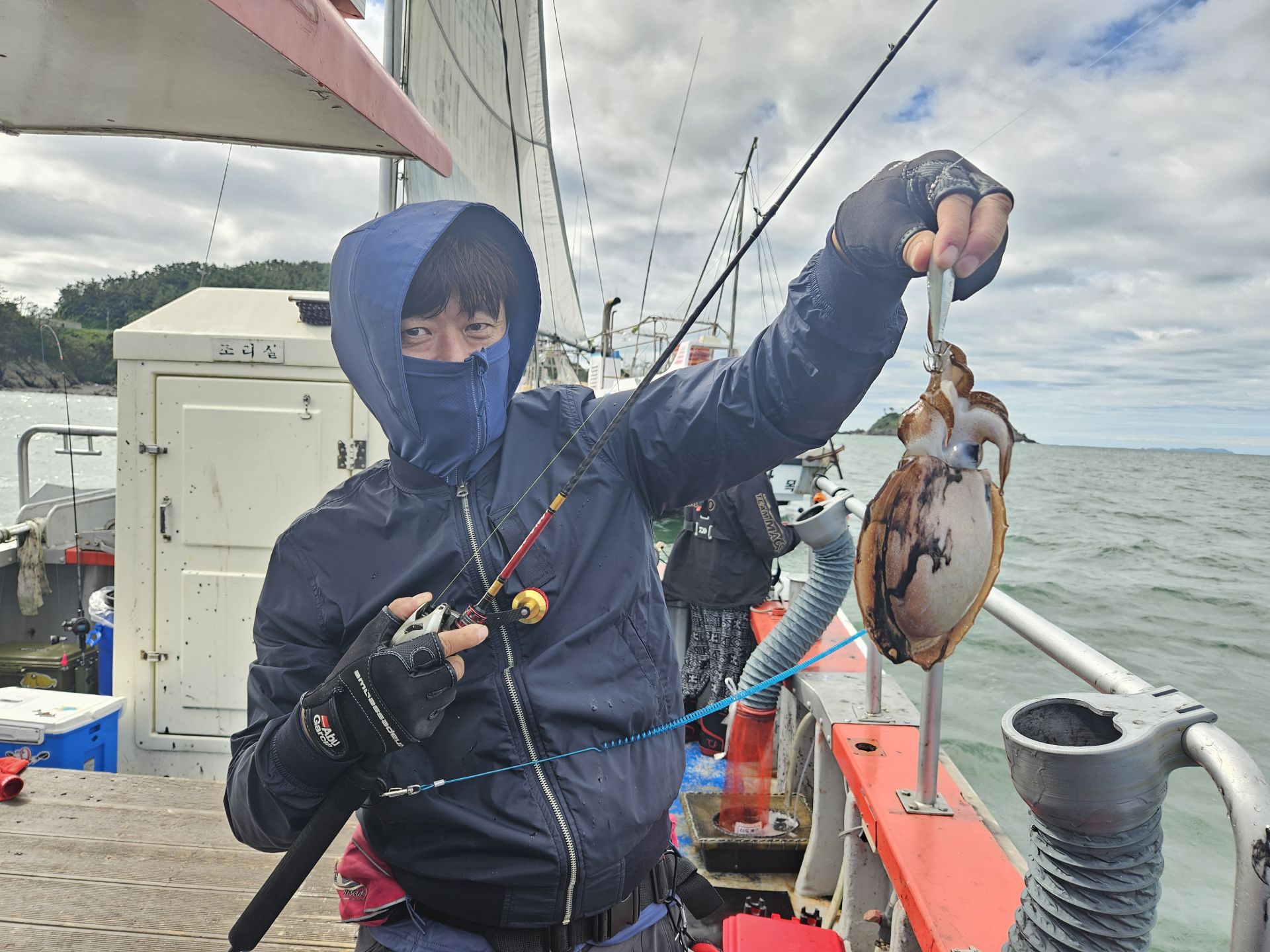 대여 낚시가총 5대.초보 조사님들이 대부분이고 그나마 갑오징어좀 잡으실줄 아시는 조사님은 몇분 안계신 상황에서 여러 포인트를 확인하며 이삭 줍기 식으로 한마리 한마리 올리는 상황 이네요. 심한 파도에 선실 신세지신 조사님도 계시고...