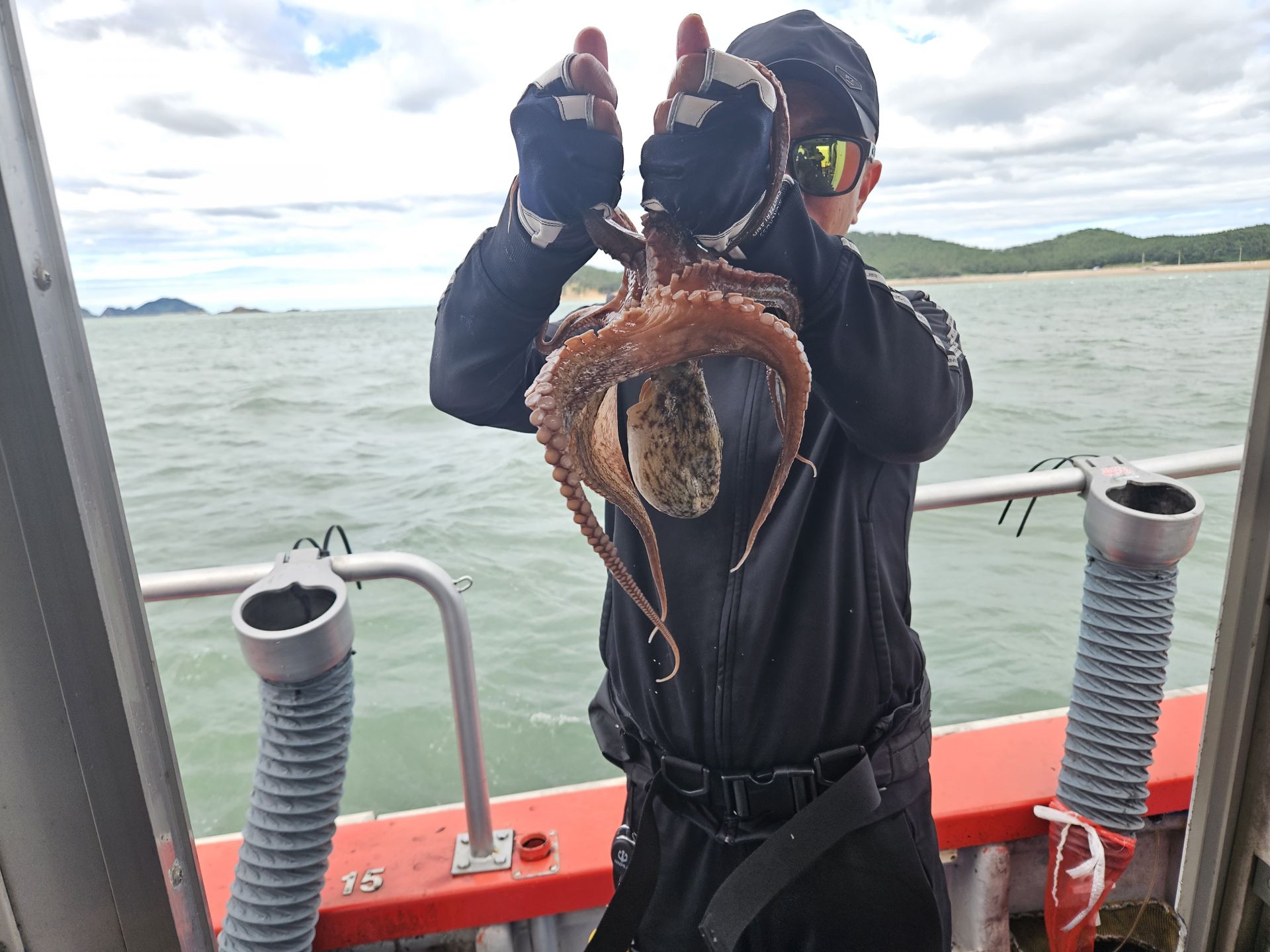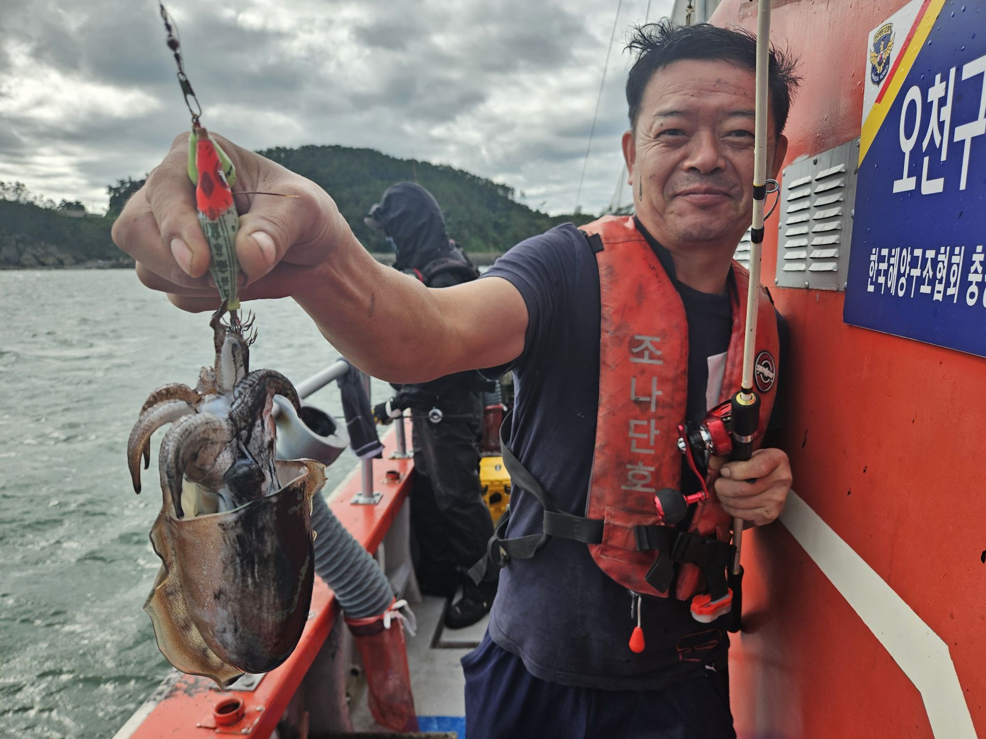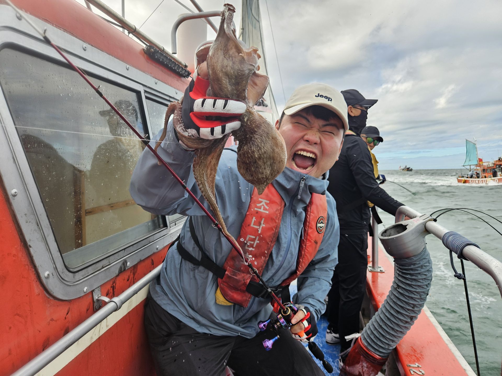 대여 낚시가총 5대.초보 조사님들이 대부분이고 그나마 갑오징어좀 잡으실줄 아시는 조사님은 몇분 안계신 상황에서 여러 포인트를 확인하며 이삭 줍기 식으로 한마리 한마리 올리는 상황 이네요. 심한 파도에 선실 신세지신 조사님도 계시고...