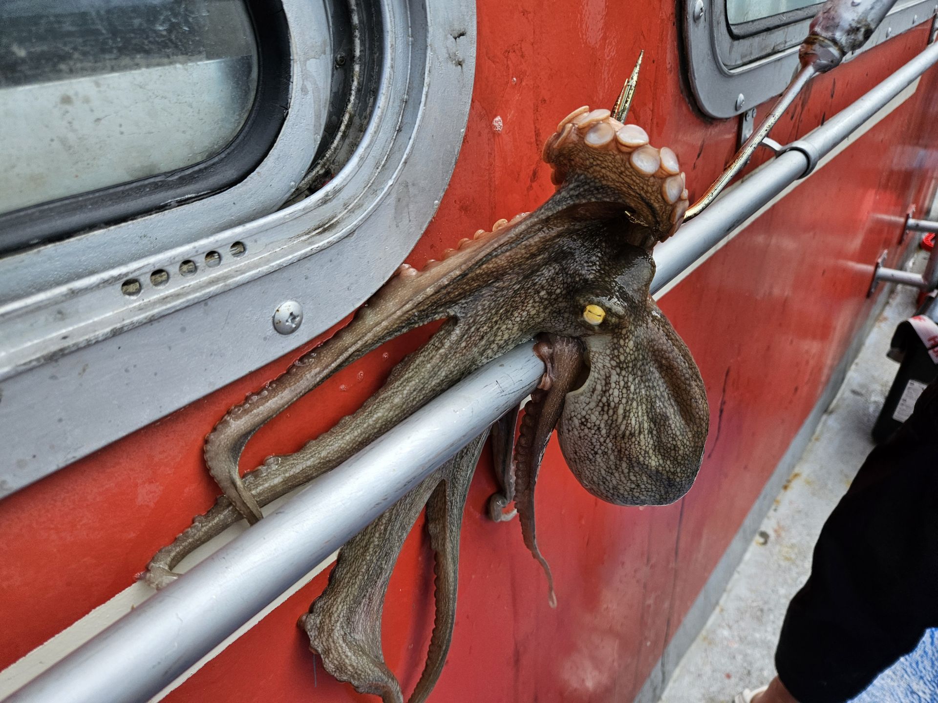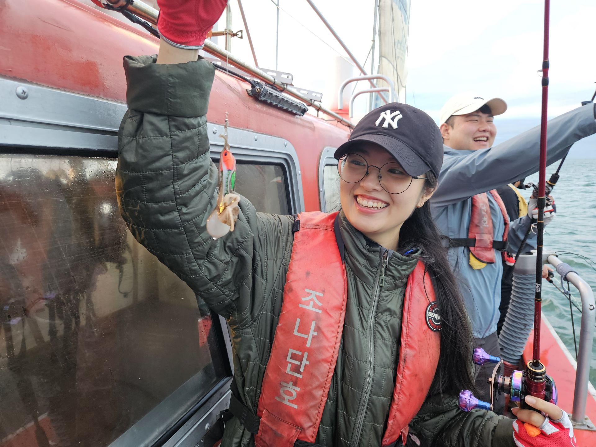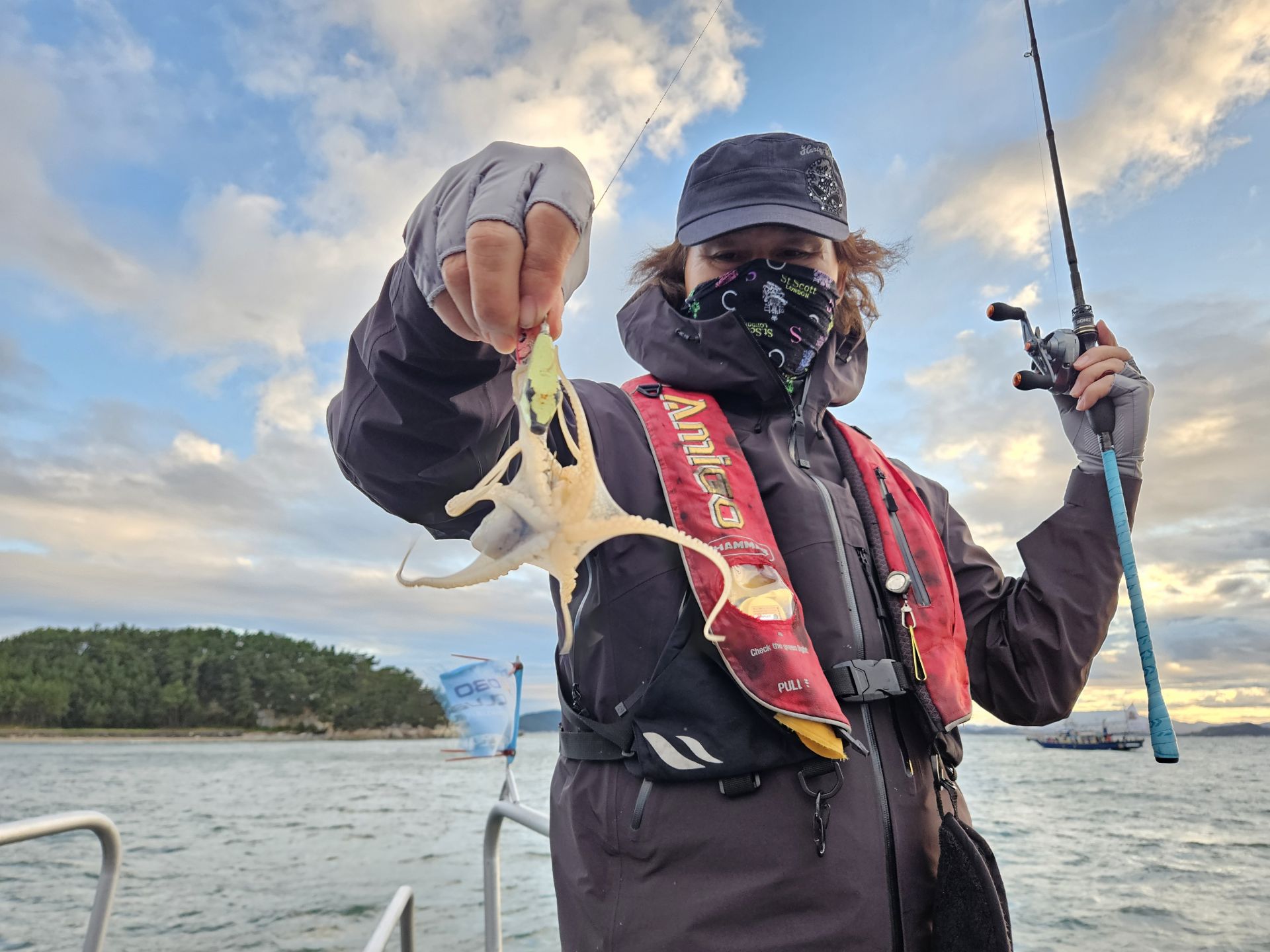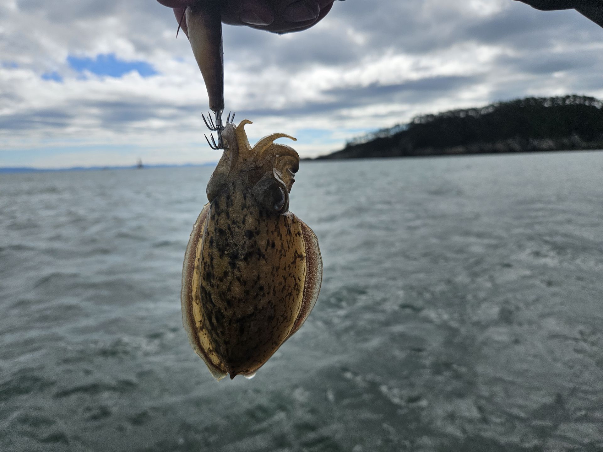 대여 낚시가총 5대.초보 조사님들이 대부분이고 그나마 갑오징어좀 잡으실줄 아시는 조사님은 몇분 안계신 상황에서 여러 포인트를 확인하며 이삭 줍기 식으로 한마리 한마리 올리는 상황 이네요. 심한 파도에 선실 신세지신 조사님도 계시고...